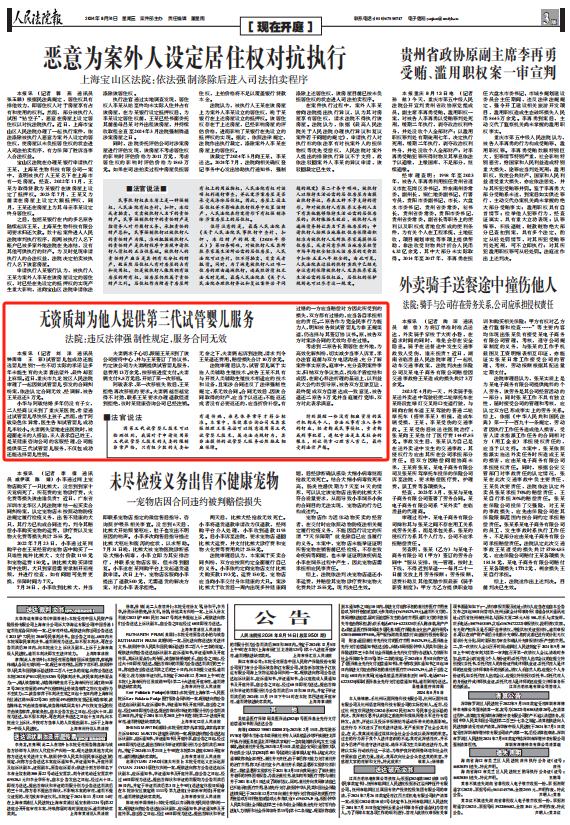 近日,法院服務法院法律《人民法院報》第三版刊登《無資質卻為他人提供第三代試管嬰兒服務 法院:違反法律強制性規定,報丨服務合同無效》一文,無資為人違反務合內容如下: